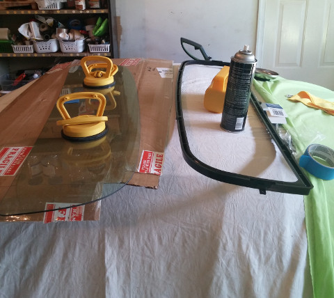 Some of the supplies used to install new rear glass can be seen in