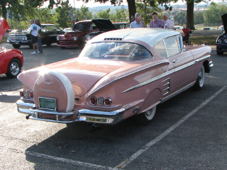 Ever hear of a Pink Cadilliac? Well here is a pink 58 Impala Belair 2 DR/HT with a Continential spare tire in the back. Great 50's styling. Beautifully done.