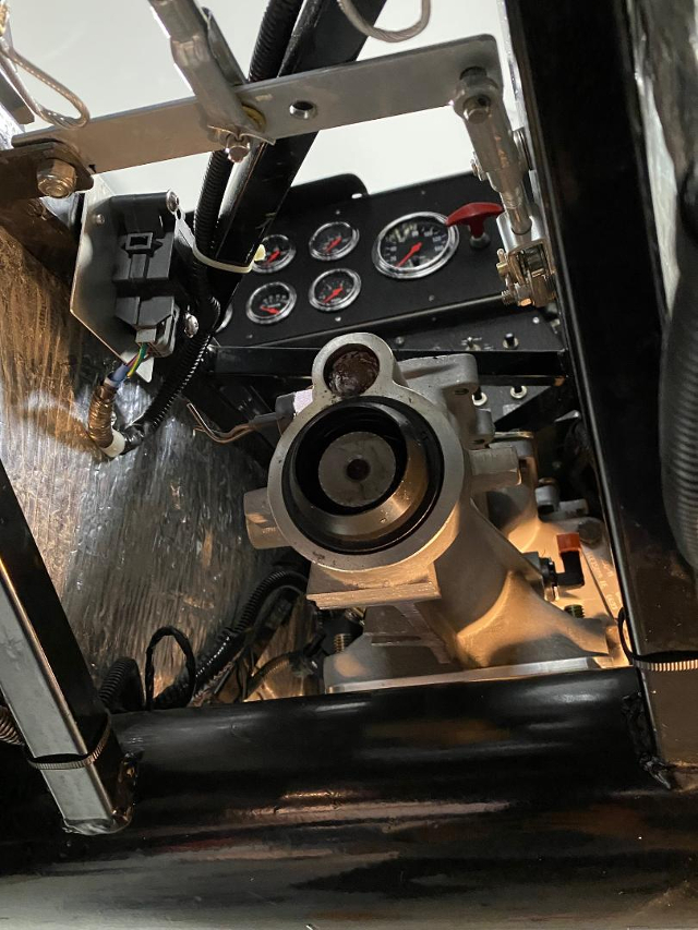 flywheel bolts. Emergency brake leverage is on the top. On left there is a black plastic inertia switch