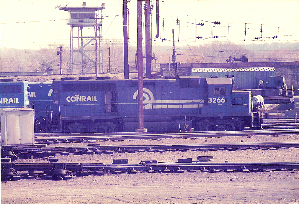 On the left is a C&O road switcher. To the right are several CONRAIL road switchers; sanding towers are behind where GG1's parked in our 1960s photos. Behind the sanding facilities are three cars on the hump. |